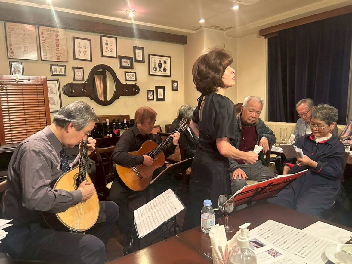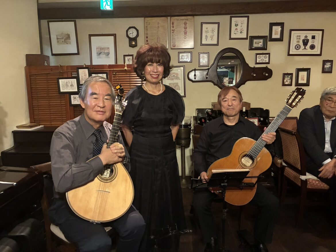 2025,10.26、東京の半蔵門駅番町通り出口近くにあるイタリアンレストラン「リコルディ」という店で、峰万里江さんのファドの伴奏に、ポルトガルギターの渡辺隆哉さんと、ビオラ(ファドではクラシックギターの事)の私(大場俊郎)でライブ参加してきました。17:30~の食事提供の予定でしたが、1時間位前から来られた方もあり、少しお店の方も焦り、私たちもリハーサル中で焦りましたが、皆さん峰さんのお知り合いの方々のようでした。 食事をとって頂いた後のライブ開始です。皆さんワインを飲みながら。峰さんの歌、そしてギタラーダ(インストのみの演奏)や、トークも入れながら、楽しんで頂けたかなと思います。ビオラでの伴奏は、ベースと和音の出し方等、なかなか奥深いものがあります。私は初めてなので大変良い経験になりました。